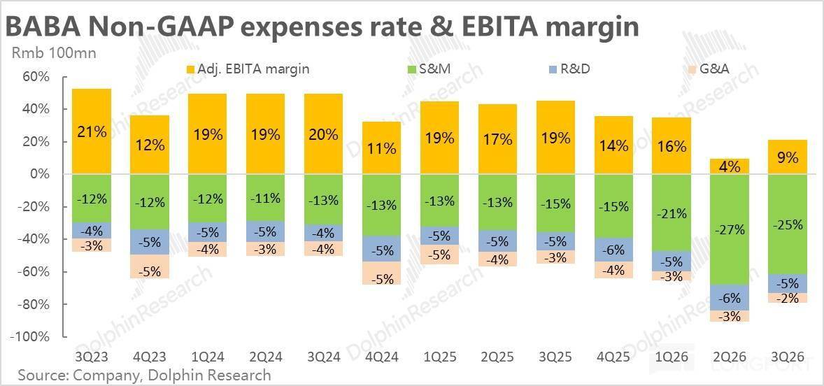 另外,虽从调研来看,淘宝闪购的订单结构是在优化的(高单价的正餐和非餐闪购比重增加),但从本季度来看,似乎成果暂未体现出来。