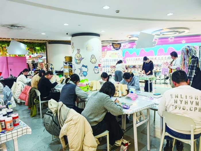 记者在上海市第一百货商店C馆五楼中庭看到,大量年轻人正在“伏案工作”。走近才发现,他们正在认真制作拼豆(用小珠子拼像素图)、咕卡(用材料装饰亚克力卡片)、痛板(二次元元素装饰板)等。商家表示,顾客支付的是材料费,也是教学与体验的费用,为的就是独此一份的新鲜感。