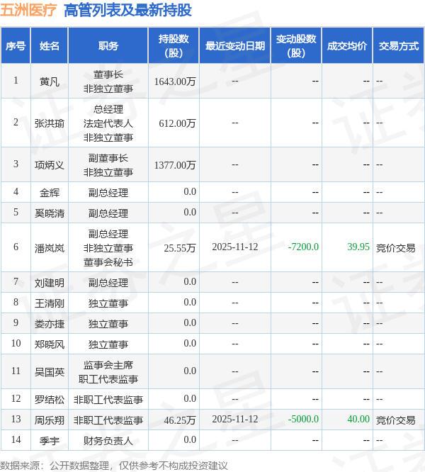 五洲医疗近半年内的董监高及核心技术人员增减持详情如下: