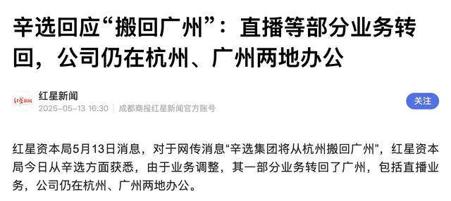 今年5月,辛选集团又将直播等部分业务转回广州。
