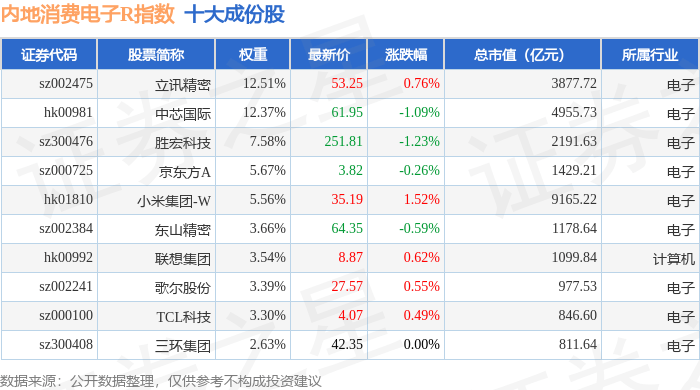 资金流向方面,内地消费电子R(483105)指数成份股当日主力资金净流出合计10.78亿元,游资资金净流出合计1367.11万元,散户资金净流入合计10.91亿元。成份股资金流向详情见下表: