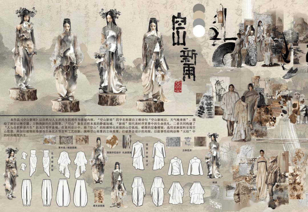 设计理念: 灵感源自石斛的自然美与疗愈特质,以天然植物纤维为料、中草药汁水染色。变形石斛花图案融入印染,将其生命力化为“治愈”符号,融新中式与都市疗愈,让服装成为情绪寄托。