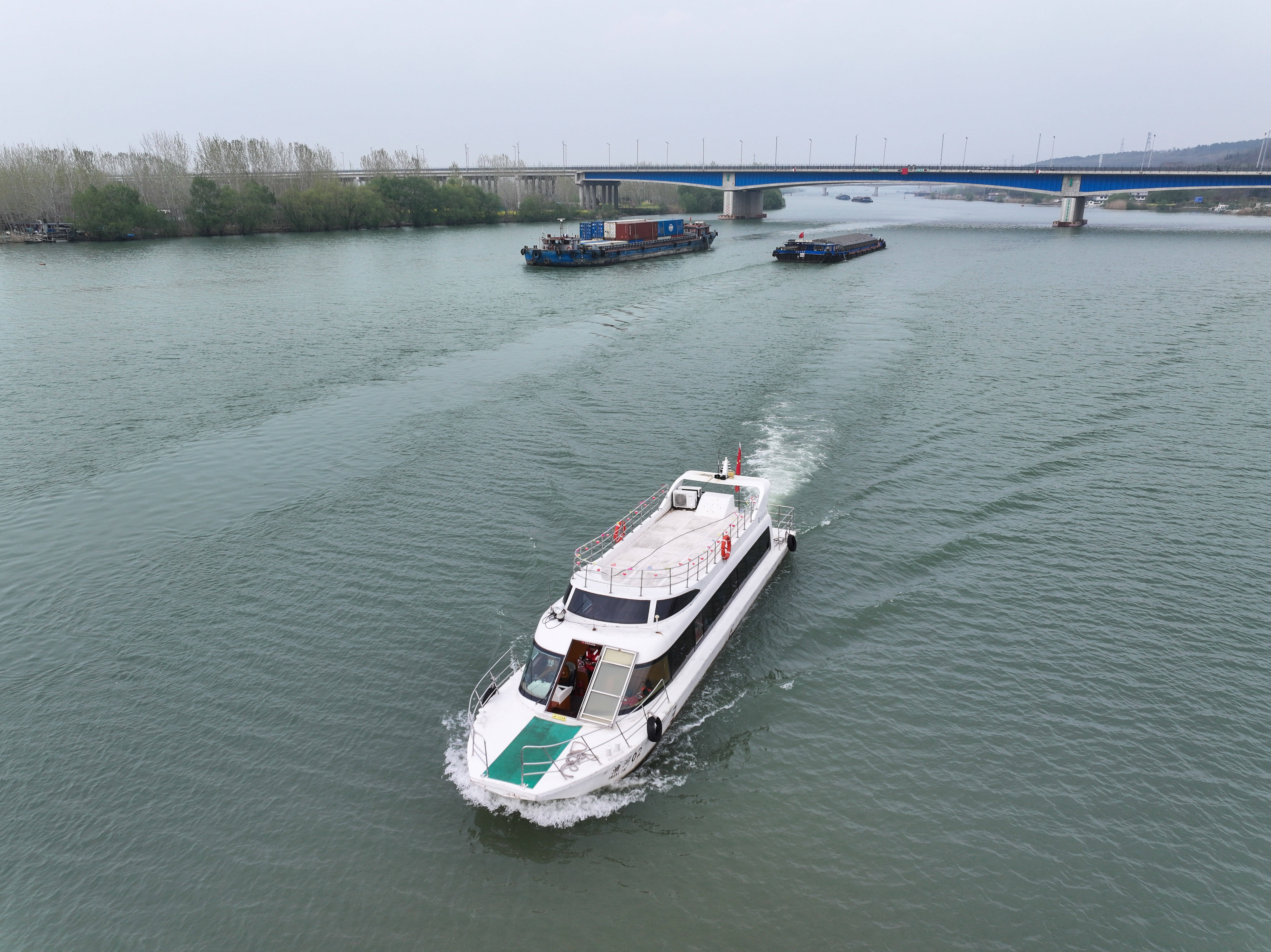 4月3日,游人在盱眙乘坐观光船游览淮河风光(无人机照片)。 新华社记者 季春鹏 摄