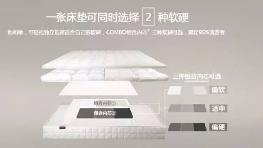 SLEEP品牌独创的COMBO垫层包括偏软、偏硬二种软硬程度,其中一张床垫还可享受两种软硬组合。