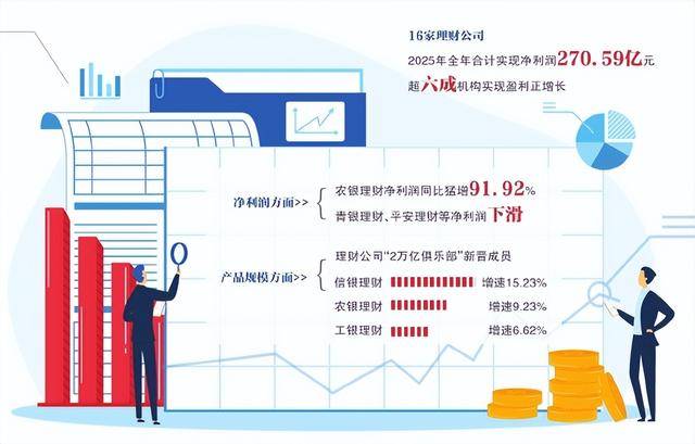 随着A股上市银行年报密集披露,招银理财、兴银理财、信银理财、农银理财、工银理财、中银理财、光大理财、交银理财、建信理财、浦银理财、民生理财、中邮理财、华夏理财、平安理财、青银理财、浙银理财、渝农商理财等17家理财公司的2025年度成绩单也浮出水面。北京商报记者梳理发现,2025年理财公司整体经营呈现出稳健态势,从已披露净利润数据的16家理财公司来看,全年合计实现净利润270.59亿元,超六成机构实现盈利正增长。