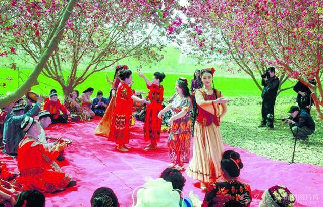 4月8日,民间艺人在阿瓦提县刀郎部落景区表演刀郎木卡姆。伴随欢快音乐,游客与艺人花间起舞,乐享美好时光。颜寿林摄