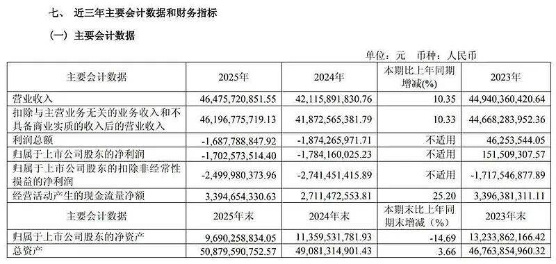 2024年营收同比下滑6.28%至421.16亿元;归母净利润及扣非后净利润分别为-17.84亿、-27.41亿元。拉长时间看,公司主营业务“造血”能力长期匮乏,扣非后净利润已连续9年深陷亏损,2017-2025年亏损额累计约163亿元。
