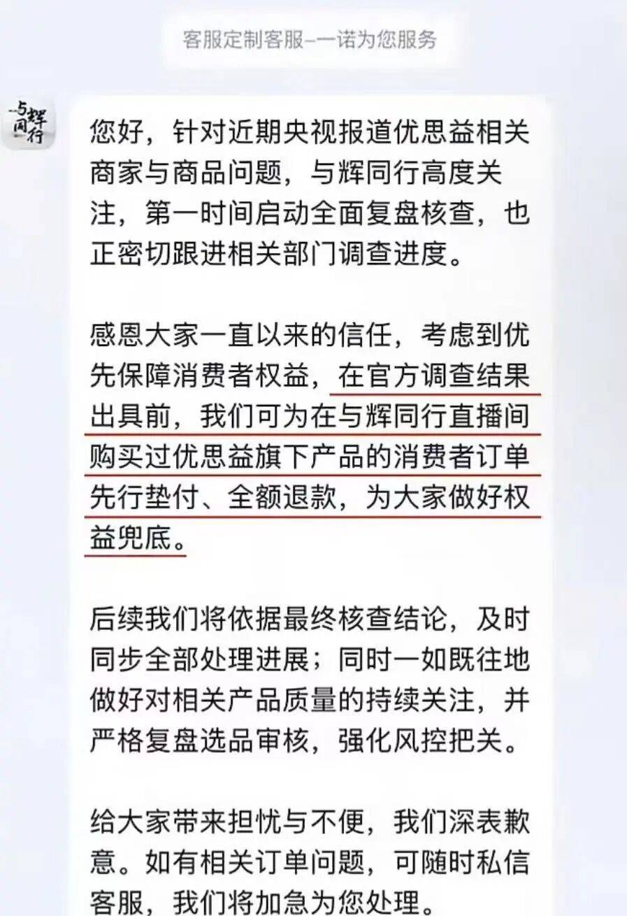 字面上,消费者有了兜底,但对比之下,与辉同行的回应里缺席了董宇辉本人的道歉。客服用“深表歉意”含糊带过。不少消费者质疑其未按“假一赔三”规定处理,且声明未通过官方渠道发布,只是客服的表态,诚意不足。