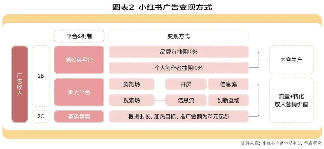 三大广告平台。小红书的广告变现主要通过三大平台实现:蒲公英平台、聚光平台和薯条,三大平台定位不同、运作模式各异。(图表2)