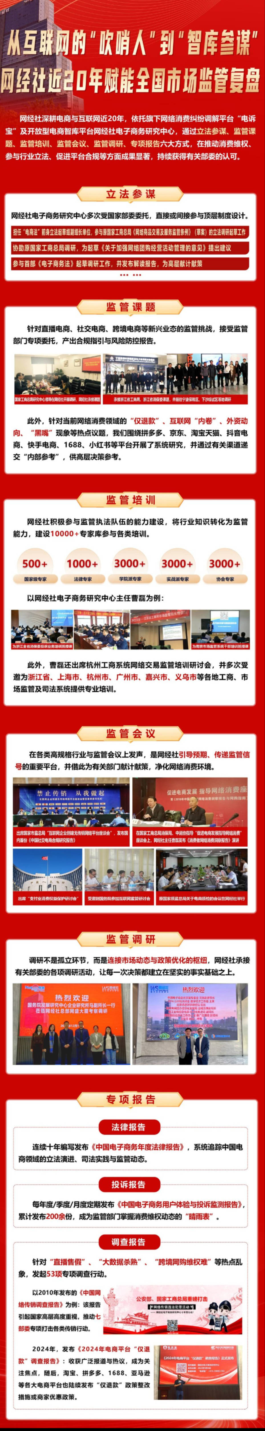 网经社深耕电商与互联网近20年,依托旗下网络消费纠纷调解平台“电诉宝”及开放型电商智库平台网经社电子商务研究中心,通过立法参谋、监管课题、监管培训、监管会议、监管调研、专项报告六大方式,在推动消费维权、参与行业立法、促进平台合规等方面成果显著,持续获得有关部委的认可。