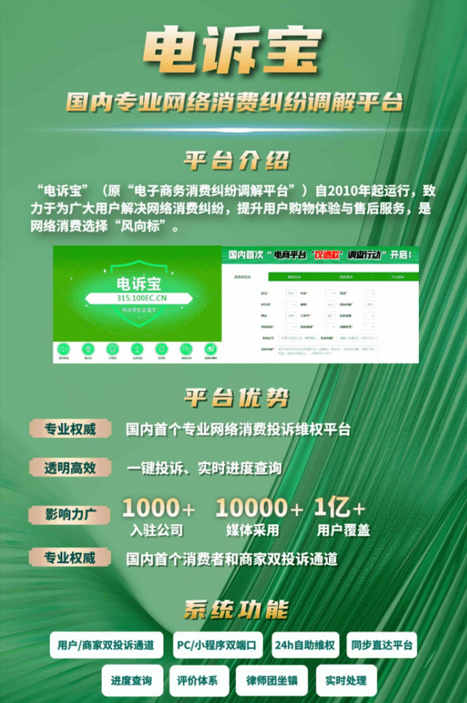 国内知名网络消费纠纷调解平台“电诉宝”运行14余年来,与全国近千家网络消费平台建立对接,影响1亿+网络消费用户,新系统实现一键投诉、24h在线、自助维权、同步直达、实时处理、进度查询、评价体系、法律求助、大数据分析等诸多功能。