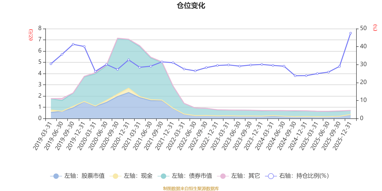 据定期报告数据统计,近三年平均股票仓位为29.38%,同类平均为19.2%。2025年末基金达到47.52%的最高仓位,2024年三季度末最低,为23.81%。