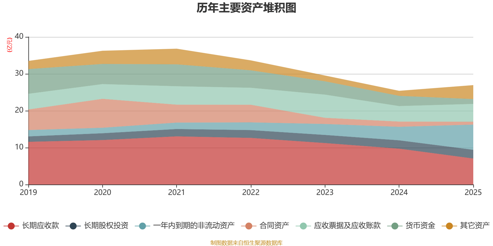 资产重大变化方面,截至2025年末,公司长期应收款较上年末减少27.63%,占公司总资产比重下降12.15个百分点;一年内到期的非流动资产较上年末增加85.26%,占公司总资产比重上升10.85个百分点;货币资金较上年末减少52.69%,占公司总资产比重下降6.03个百分点;合同资产较上年末减少44.66%,占公司总资产比重下降2.65个百分点。