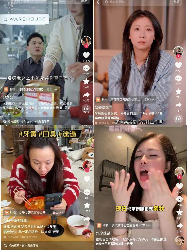 同时,参半还投放了@祝晓晗、@最美空姐蒋胖胖、@迅猛龙等千万级头部主播,并以剧情软植入的形式,广泛渗透至众多中腰部剧情类达人账号。