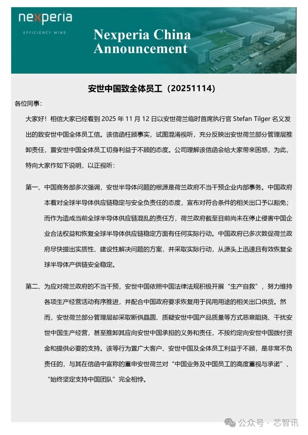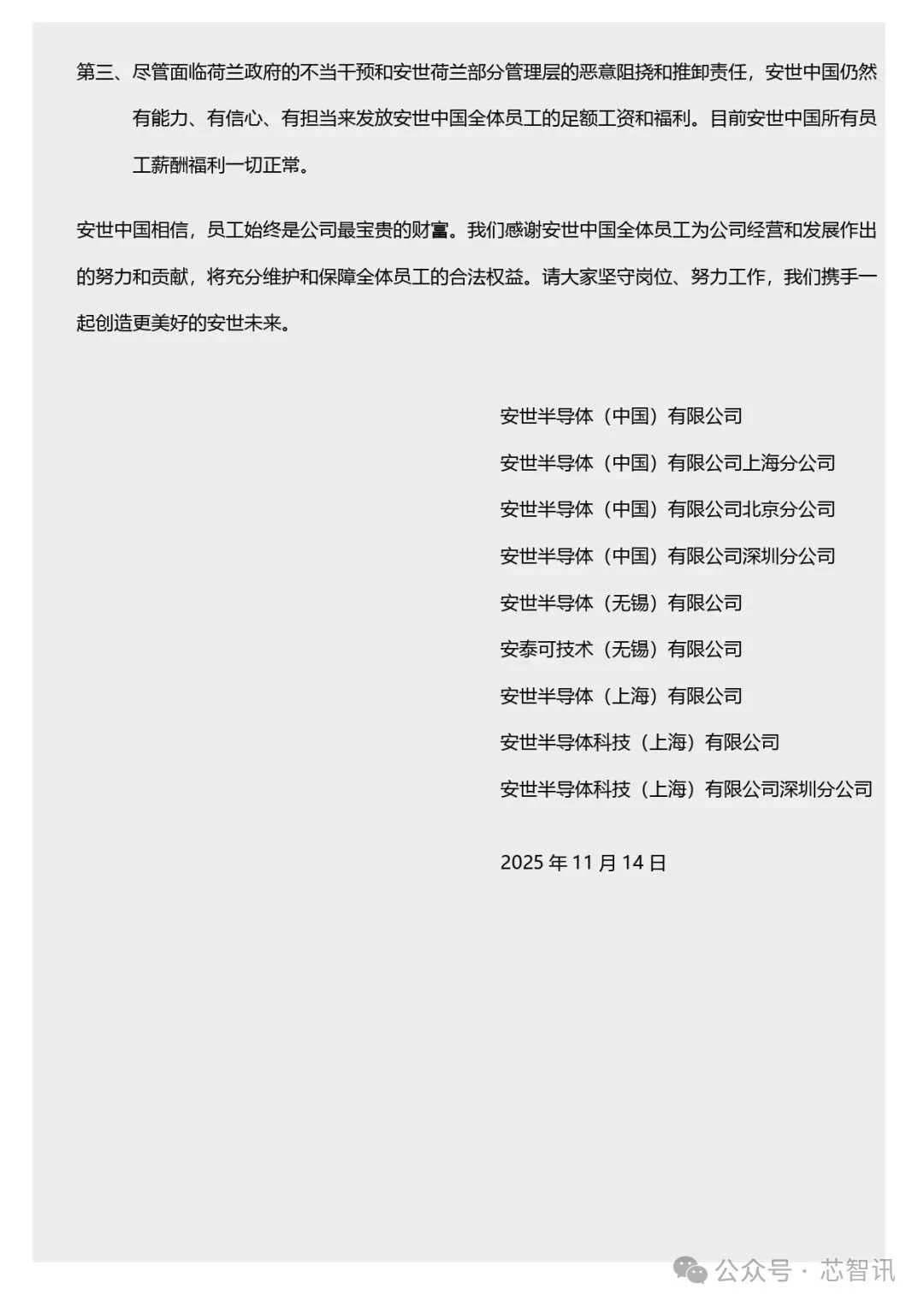 11月14日,中国安世再度发布致全体员工信,针对荷兰安世管理层发布的相关信息进行了回应。