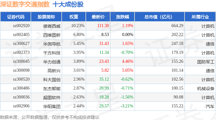 深证数字交通(970049)指数十大成份股详情如下: