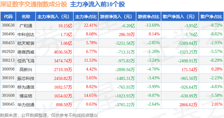 资金流向方面,深证数字交通(970049)指数成份股当日主力资金净流入合计9.7亿元,游资资金净流出合计5.96亿元,散户资金净流出合计3.74亿元。成份股资金流向详情见下表: