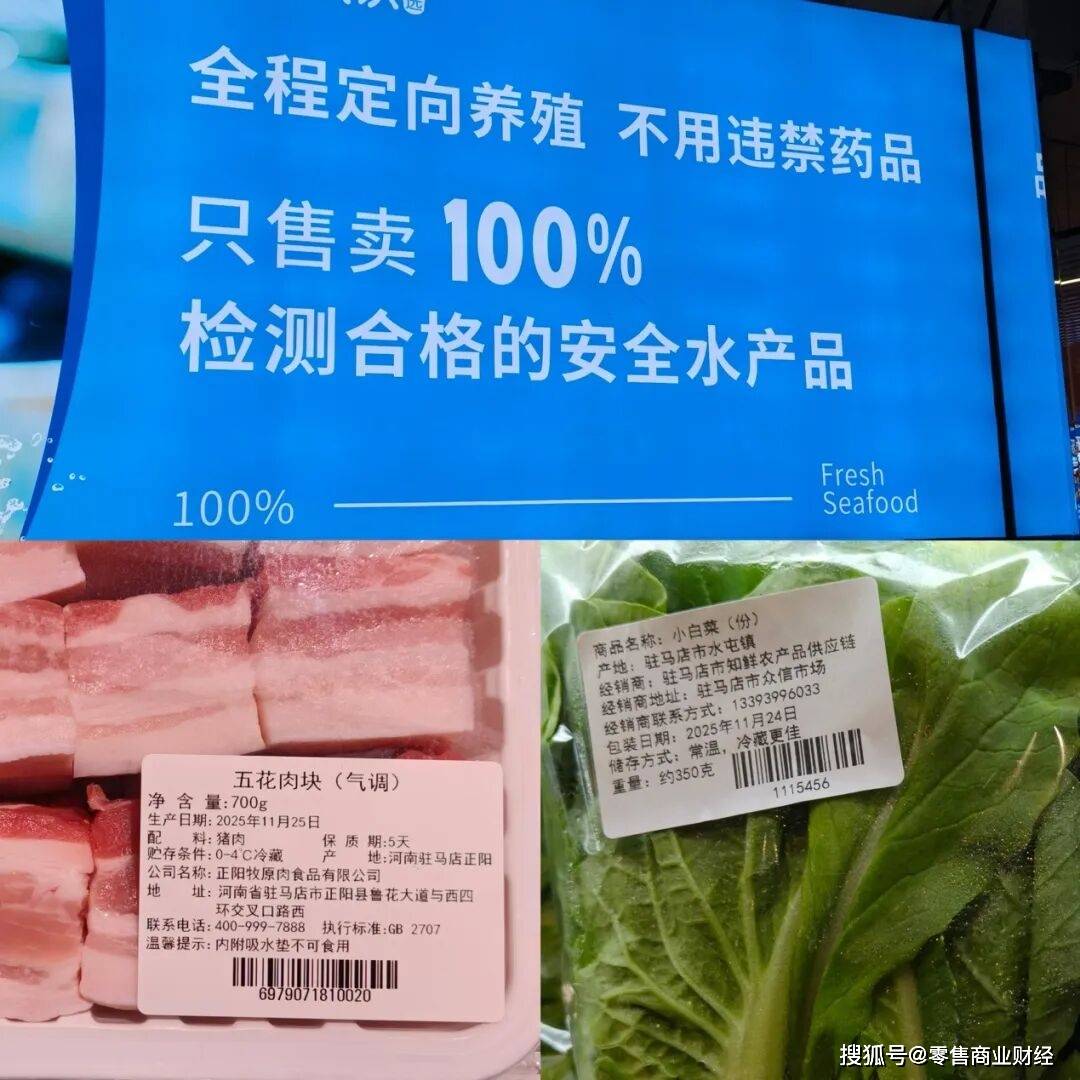 商品定价突出性价比,但这并不意味着欢乐爱家会放弃对商品品质的重视,这在超市内的各个运营细节中都有所体现,比如水产区用醒目的招牌写着:全程定向养殖、只售卖100%检测合格的安全水产品;净包装的冰鲜猪肉均来自头部企业牧原;叶菜则是当天从众信市场(本地最大的农产品交易中心)直采,确保新鲜溯源。