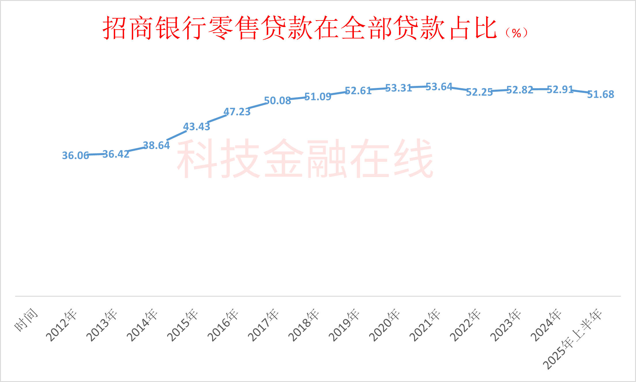 从贷款数据看,2025年上半年,零售贷款余额为3.68万亿,在全部贷款中占比超过51.68%,也回落到了2018年水平。