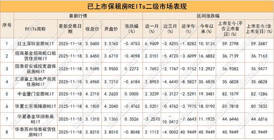 2025年11月18日当日,8只REITs涨跌分化,5只下跌、3只上涨,整体波动幅度控制在1%以内,体现出较强的抗波动能力。