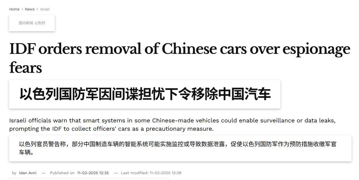 11月4日曝光的一份安全分析报告显示,中国车上的高清360度摄像头可能会捕捉到军事演习、部队调动等敏感信息。可任何有常识的人都知道,民用车的摄像头主要是为了辅助驾驶或停车监控,拍摄范围和精度远远达不到窃取军事机密的程度。而且这些功能大多可以手动关闭。以色列军方在对车辆做过数据切断处理后,依然坚持认为“风险未消除”,显然只是找借口而已。更讽刺的是,以色列本身有将民用设备改装为武器的历史,现在却反过来指责中国民用汽车“存在间谍风险”,这显得有些“贼喊捉贼”。