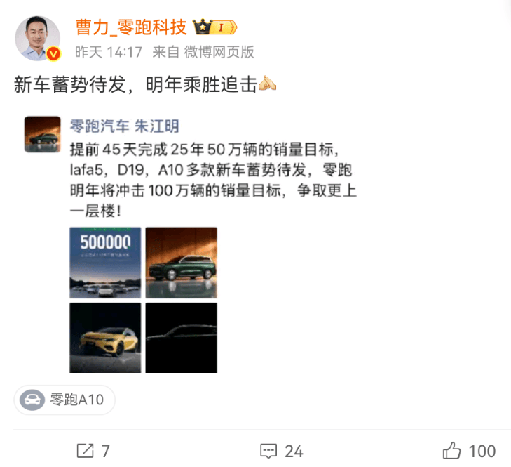 零跑科技高级副总裁曹力在微博转述了创始人、董事长兼CEO朱江明的朋友圈言论,朱江明表示,lafa5、D19、A10多款新车蓄势待发,2026年将冲击100万台销量目标。
