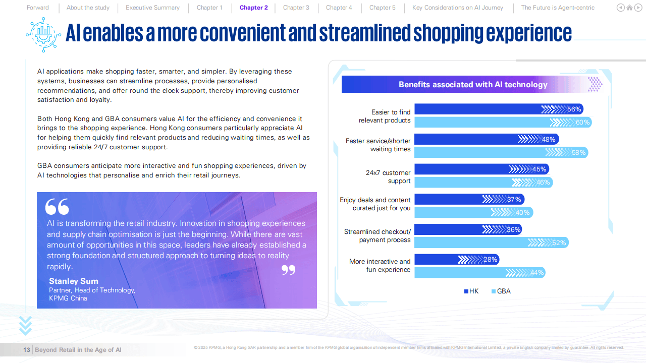 AI与人文关怀的平衡是关键挑战。AI虽提升购物便利性,如图片搜索、人脸识别结账,但难以满足情感需求。香港消费者对AI信任度(28%)远低于GBA(59%),仅39%香港消费者满意聊天机器人服务。因此,零售商需融合AI效率与员工同理心,例如通过AI助手辅助购物,同时保留员工提供情感支持与复杂问题解决的角色。