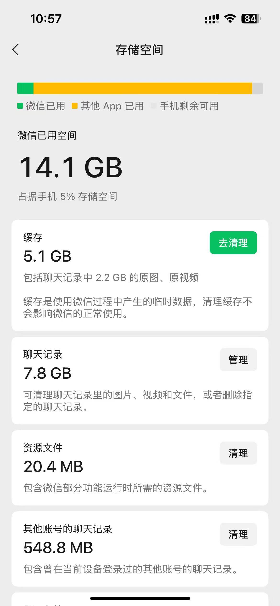 不过这个博主的数据可能有点夸张,99%的人都用不了这么多。以小雷256GB的实际为例,微信内存仅14GB,存储空间已经有点捉襟见肘了。