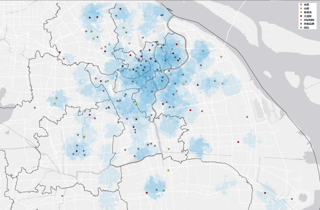 盒马鲜生15分钟自行车等时圈(模拟半小时配送范围)与超市区位的关系。从图中可以看到闭店密集区域盒马的配送区域也大范围相互覆盖。