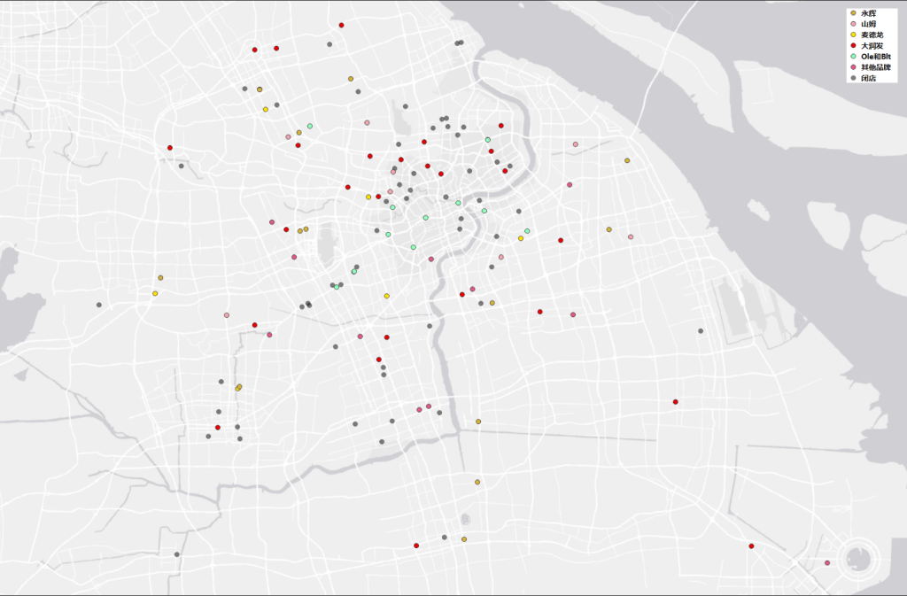 根据POI分析,还可以发现尚在营业的店铺占比更大,但市区里宝山区南部和普陀区的闭店率显著更高,郊区中9号线沿线、松江区和闵行区南部闭店率也较高;静安、虹口、杨浦、长宁、黄浦和徐汇等城市核心区以Ole为主,北部内环内外则以大润发为主。