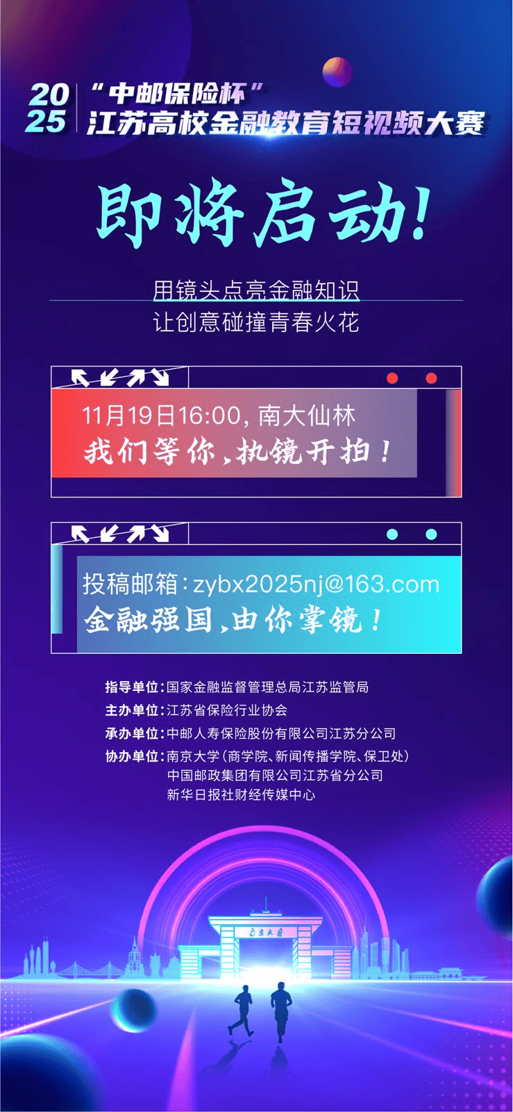 11月19日,一场属于江苏青年学生的金融短视频大赛——2025“中邮保险杯”江苏高校金融教育短视频大赛,将在百年学府南京大学仙林校区正式启动!