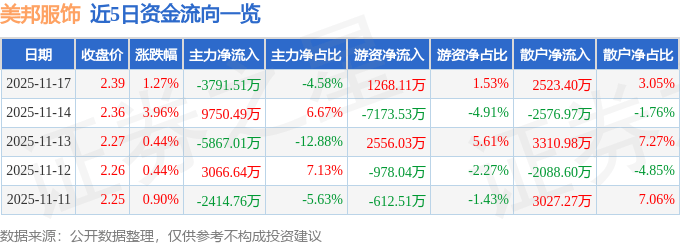 证券之星消息,截至2025年11月17日收盘,美邦服饰(002269)报收于2.39元,上涨1.27%,换手率13.81%,成交量346.98万手,成交额8.28亿元。