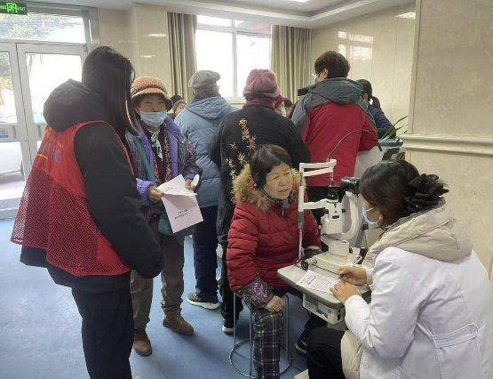 活动现场暖意融融,医护人员分工协作,为居民测量血压、血糖,细致询问日常饮食、用药及身体状况,详实记录各项检测数据。针对部分老人行动不便情况,工作人员则提供“一对一”服务,对检测结果异常的居民,医护人员现场给出专业化健康建议。爱尔眼科医院专家紧扣眼部健康核心,携带专业设备为居民开展无创眼底专项筛查,快速清晰呈现眼部细微结构,精准排查“两病”引发的眼部并发症风险,同时结合筛查情况讲解护眼知识,耐心解答居民眼部相关疑问,提醒“两病”患者重视眼部健康,做到早发现、早干预。