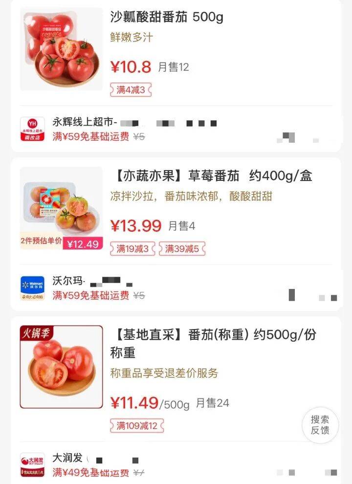 记者猛然发现,番茄的身价不知道什么时候,居然已经“奔十”了:沃尔玛,一份约550g的自然熟番茄,标价10.99元,一份约400g的草莓番茄,标价13.99元;永辉线上超市,一份500g的沙瓤番茄,标价10.8元;大润发,一份约500g的基地直采番茄,标价11.49元……盒马便宜点,一份约500g的粉番茄,刚刚卡在了9.9元。