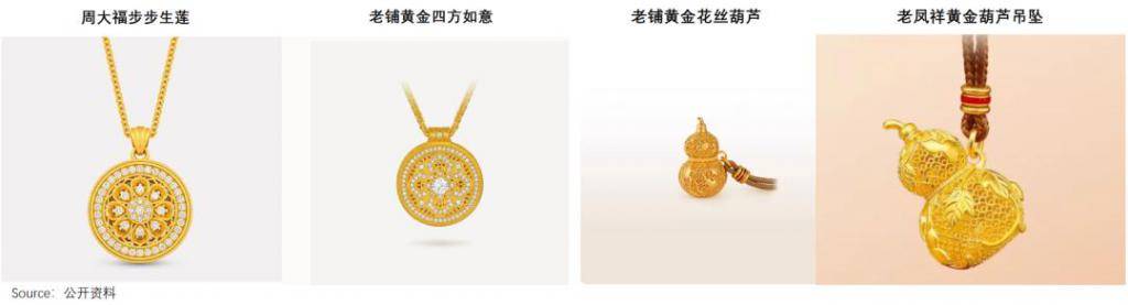 可以看到,周大福 " 传承 "、老凤祥非遗花丝等系列,与老铺的产品仿佛异父异母的 " 亲姐妹 "。