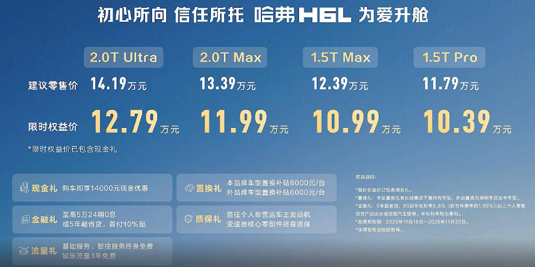 2025年11月18日,哈弗品牌官方宣布,旗下全新燃油中型SUV——哈弗H6L正式上市,新车共推出4款车型,官方指导价11.79-14.19万元,限时权益价10.39-12.79万元。作为燃油版车型,哈弗H6L搭载长城汽车最新技术的2.0T发动机,匹配9DCT变速箱,同时车身尺寸相比现款哈弗H6也有了全面提升。