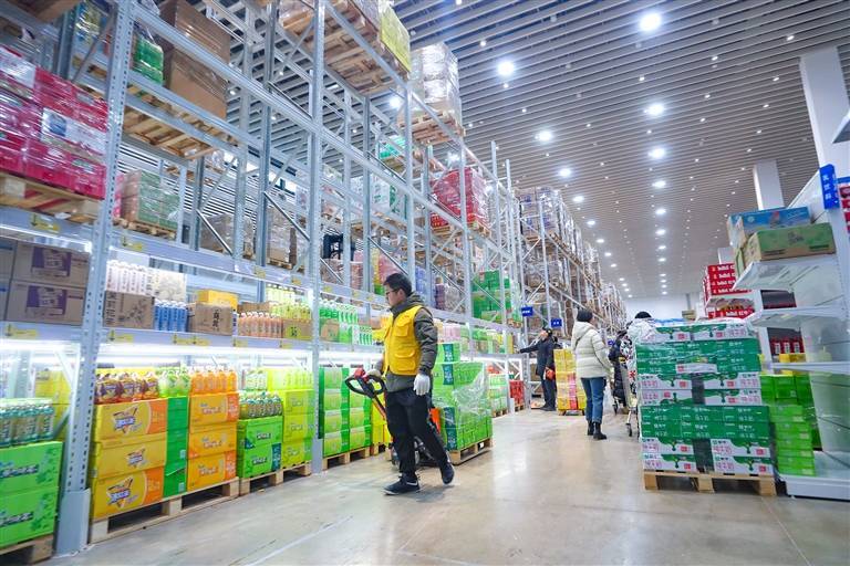 郑州市经开区中大门购物公园“折扣牛”仓储式超市,工作人员在理货。本报记者 聂冬晗 摄