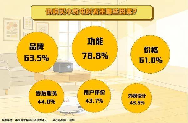 年轻人在购买小家电时,会看重哪些因素?调查中,功能是受访青年关注的首要因素,占比高达78.8%,然后是品牌(63.5%)和价格(61.0%)。另外,售后服务(44.0%)、用户评价(43.7%)、外观设计(43.5%)、能耗(31.5%)等也是受访青年会关注的因素。
