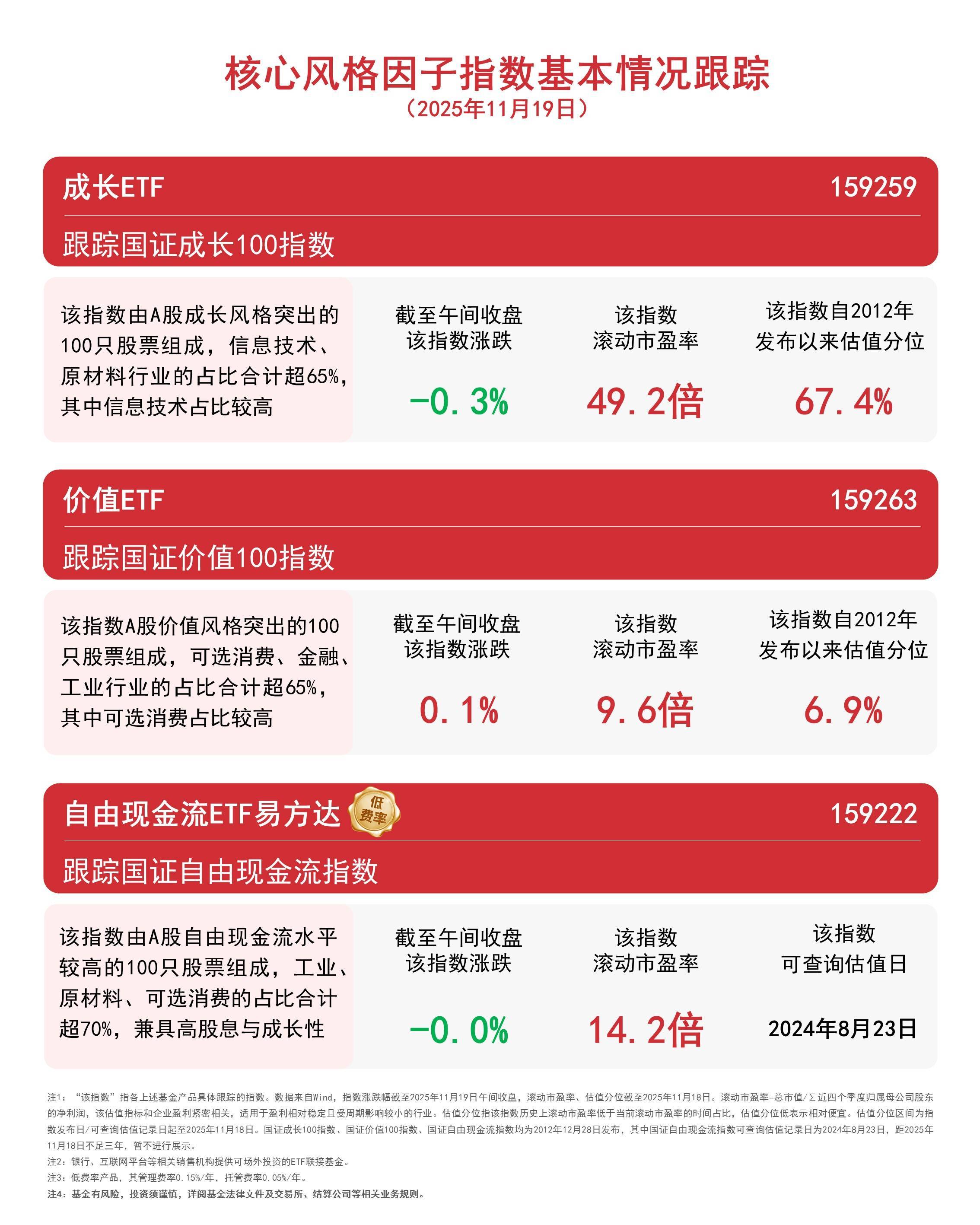 国证价值100指数采用“高分红+高自由现金流+低市盈率”三维筛选体系,优选价值标的,历史表现稳健;国证自由现金流指数则采用自由现金流率进行选样,兼具高股息与成长性。价值ETF(159263)和自由现金流ETF易方达(159222)分别跟踪以上指数,可助力投资者把握相关风格投资机遇。
