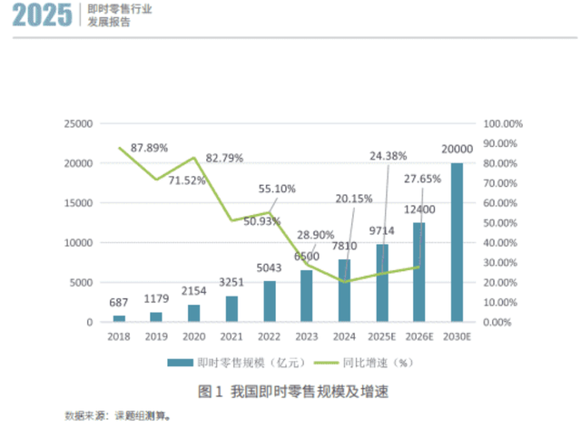 商务部研究院发布的《即时零售行业发展报告(2025)》指出,目前,我国即时零售正处于迈向万亿级规模的关键节点。2026年我国即时零售规模将突破1万亿元,预计到2030年,将达到2万亿元,“十五五”期间年均增速将达12.6%。