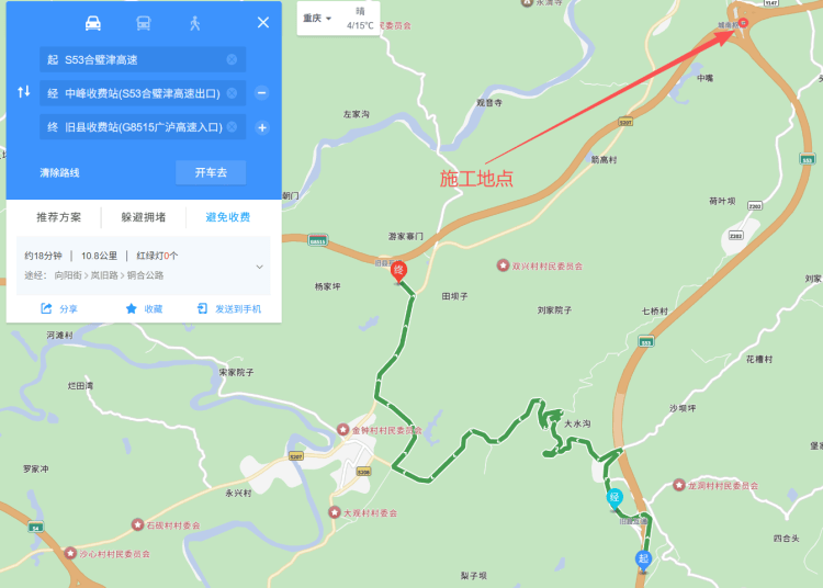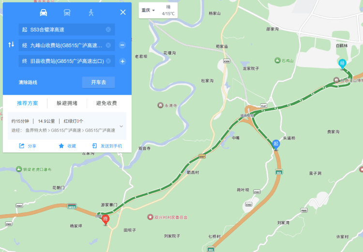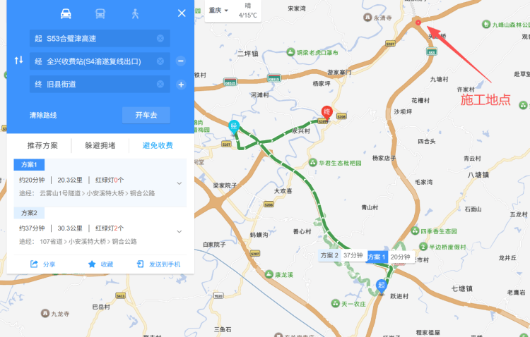 2、 路线二:依凤枢纽—S4渝遂复线—全兴收费站—旧县(用时较短)