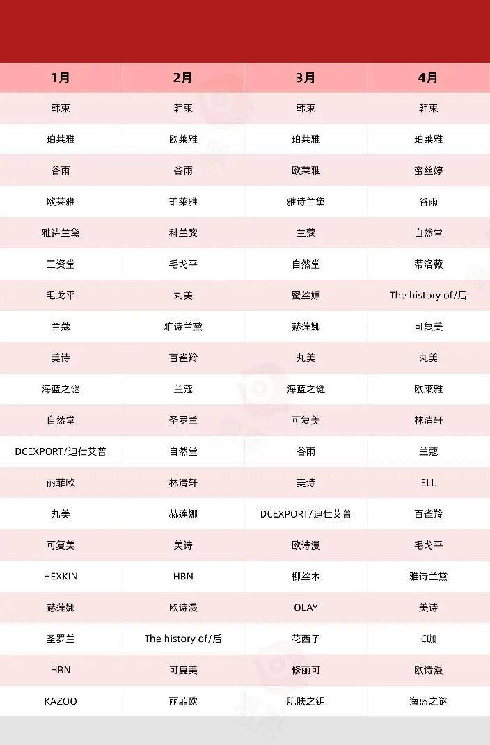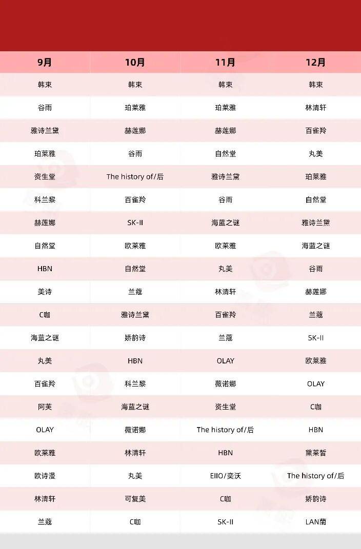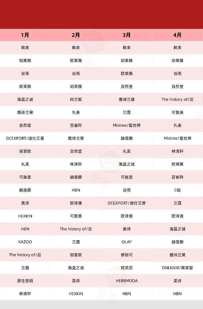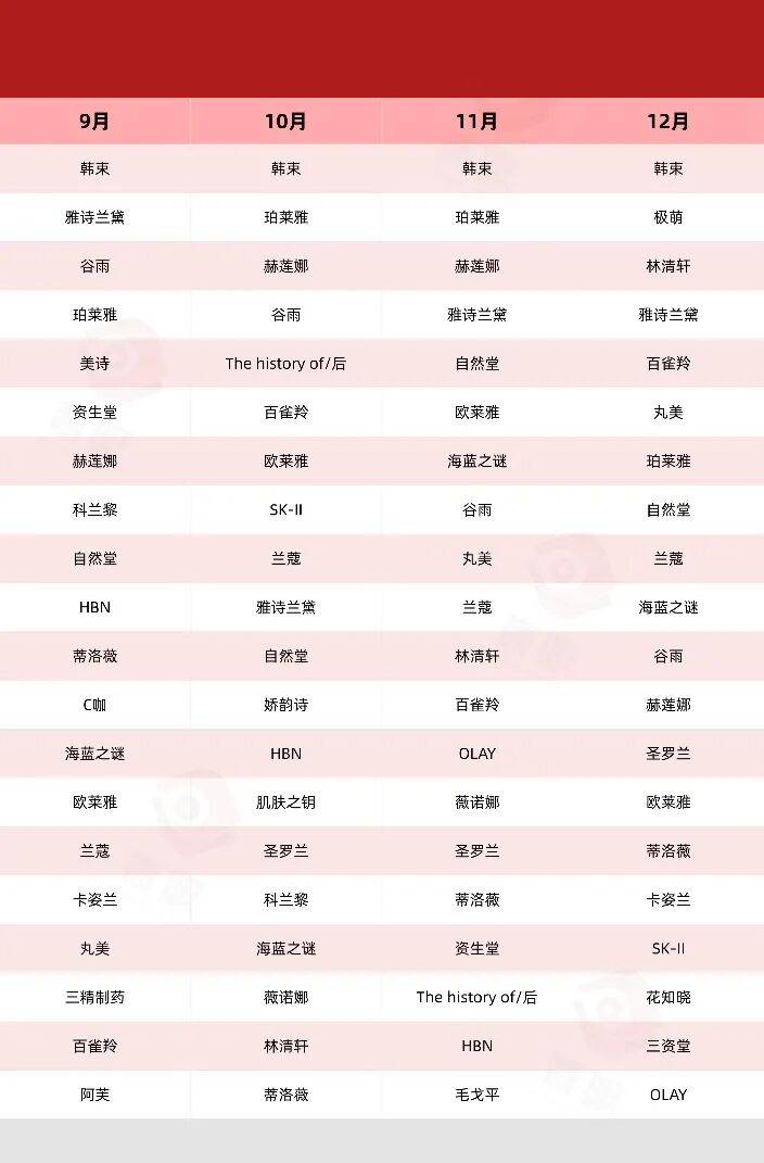 毛戈平取代花西子,成为唯一上榜的国货彩妆品牌;而来自于逸仙电商的科兰黎,则通过在2月、5月、10月前后的大促节点发力,成功迈入TOP20榜单。