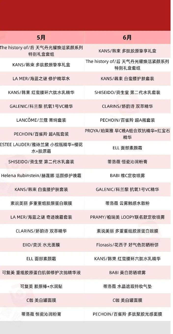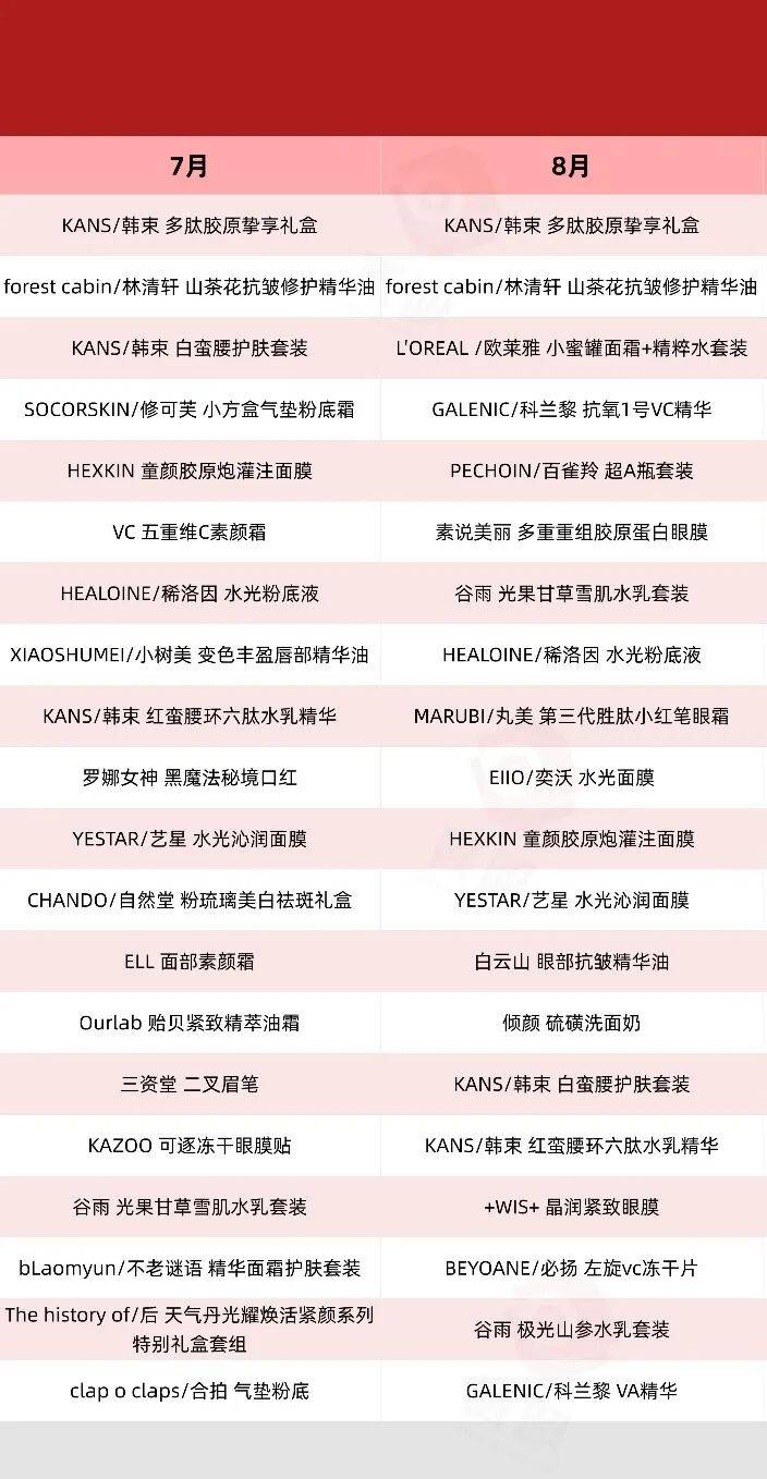 除此之外,面膜类产品和精华油类产品,是继水乳套装之外最受欢迎的产品,例如林清轩山茶花精华油、白云山眼部精华油等均多次上榜;而在面膜品类中,每个月都有不同的品牌登上榜单,包括珀莱雅、C咖、EIIO、原生密码、丸美、百雀羚、HEXKIN等等。