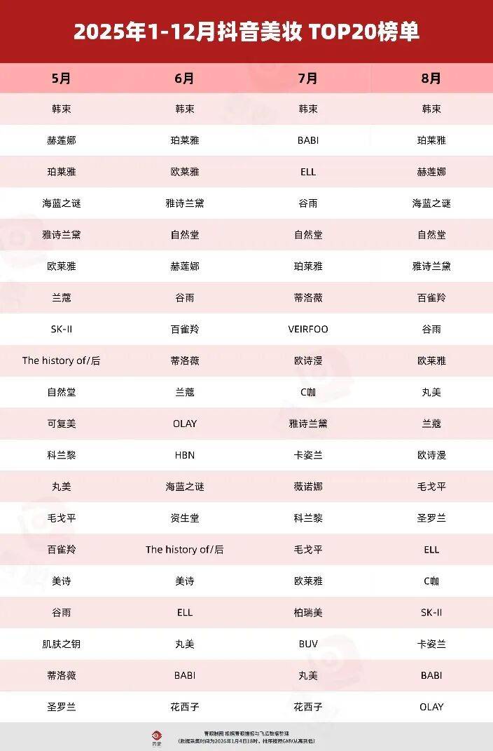 2025年,75%的品牌依旧稳居抖音美妆TOP20行列,尤其是前4大品牌,近两年均由韩束、珀莱雅、欧莱雅和雅诗兰黛牢牢占据。