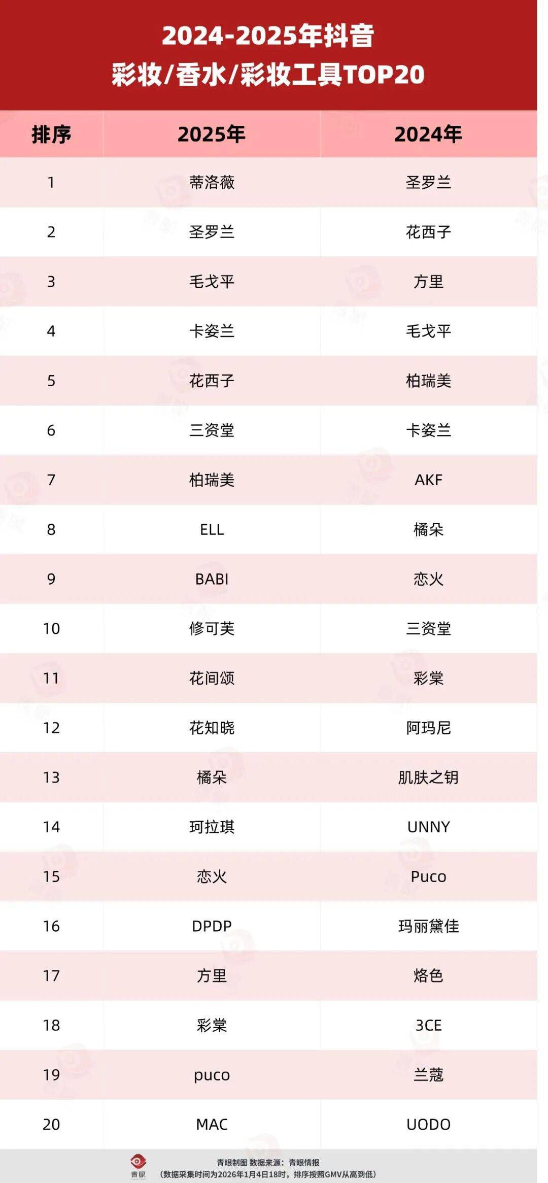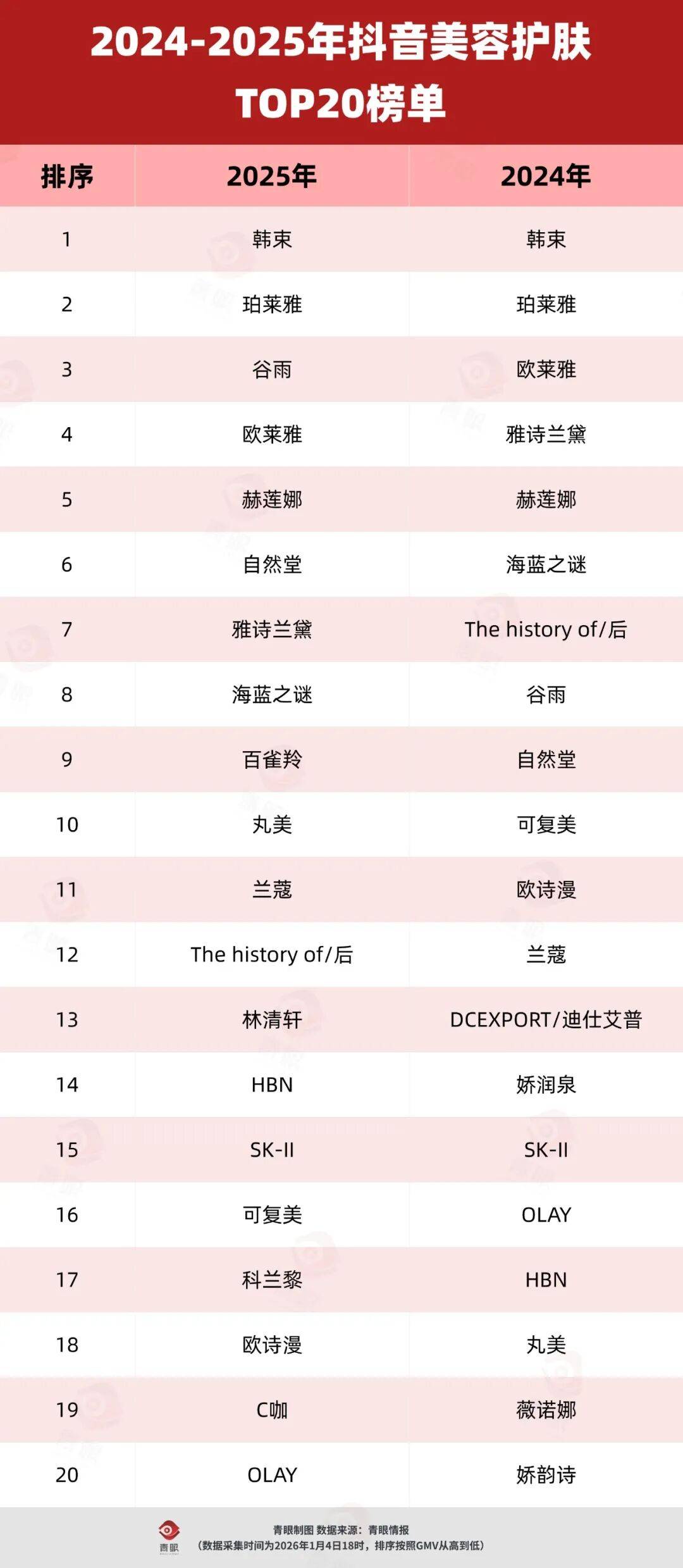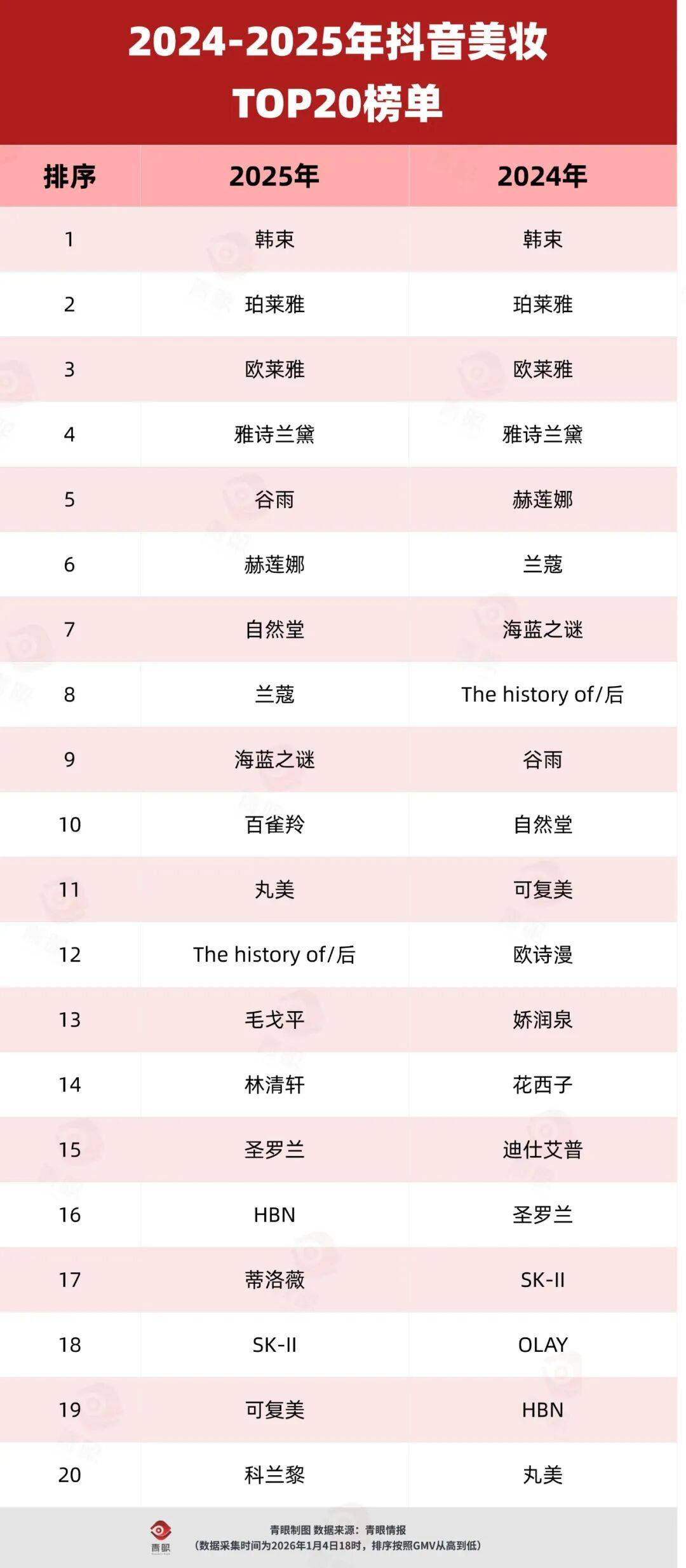 在这当中,韩束GMV呈断层式领先,据青眼情报数据显示,其2025年全年抖音GMV超70亿,是第二名的2倍。