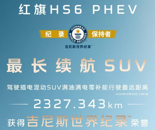 在吉尼斯见证下,红旗HS6 PHEV满油满电行驶2327.343km,获得“驾驶插电混动SUV满油满电零补能行驶最远距离”吉尼斯世界纪录荣誉!足以见得鸿鹄混动技术的扎实功底!