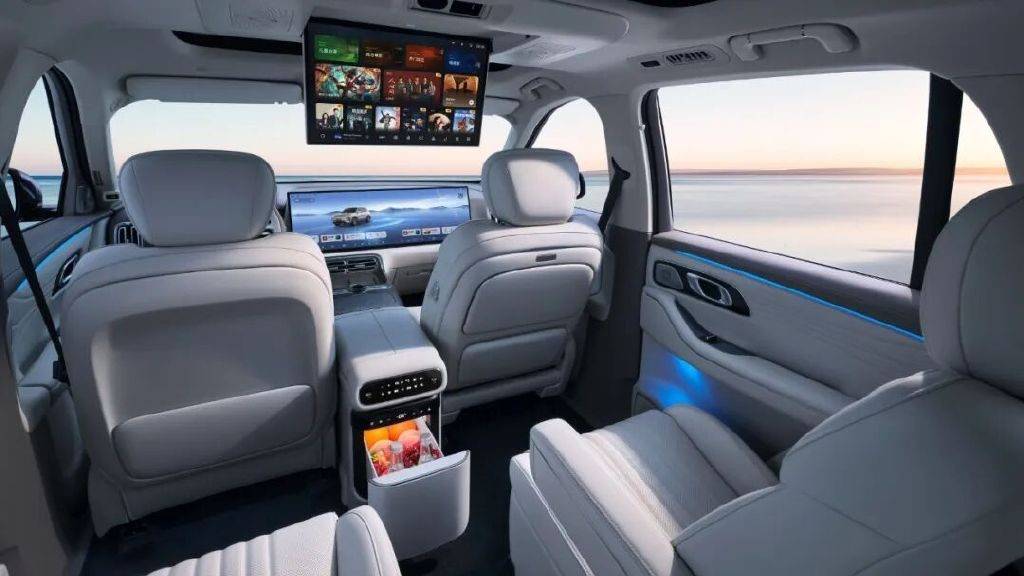 此外,还配备了零重力尊享副驾,支持10点按摩,最大躺角可达173°, Nappa真皮座椅、前后排座椅加热/通风、后排靠背电动调节、50W手机无线充电、253色氛围灯、丹拿品牌音响、感应式行李厢、6L智能冷暖双用冰箱等配置一应俱全,基本实现了座座都是VIP。