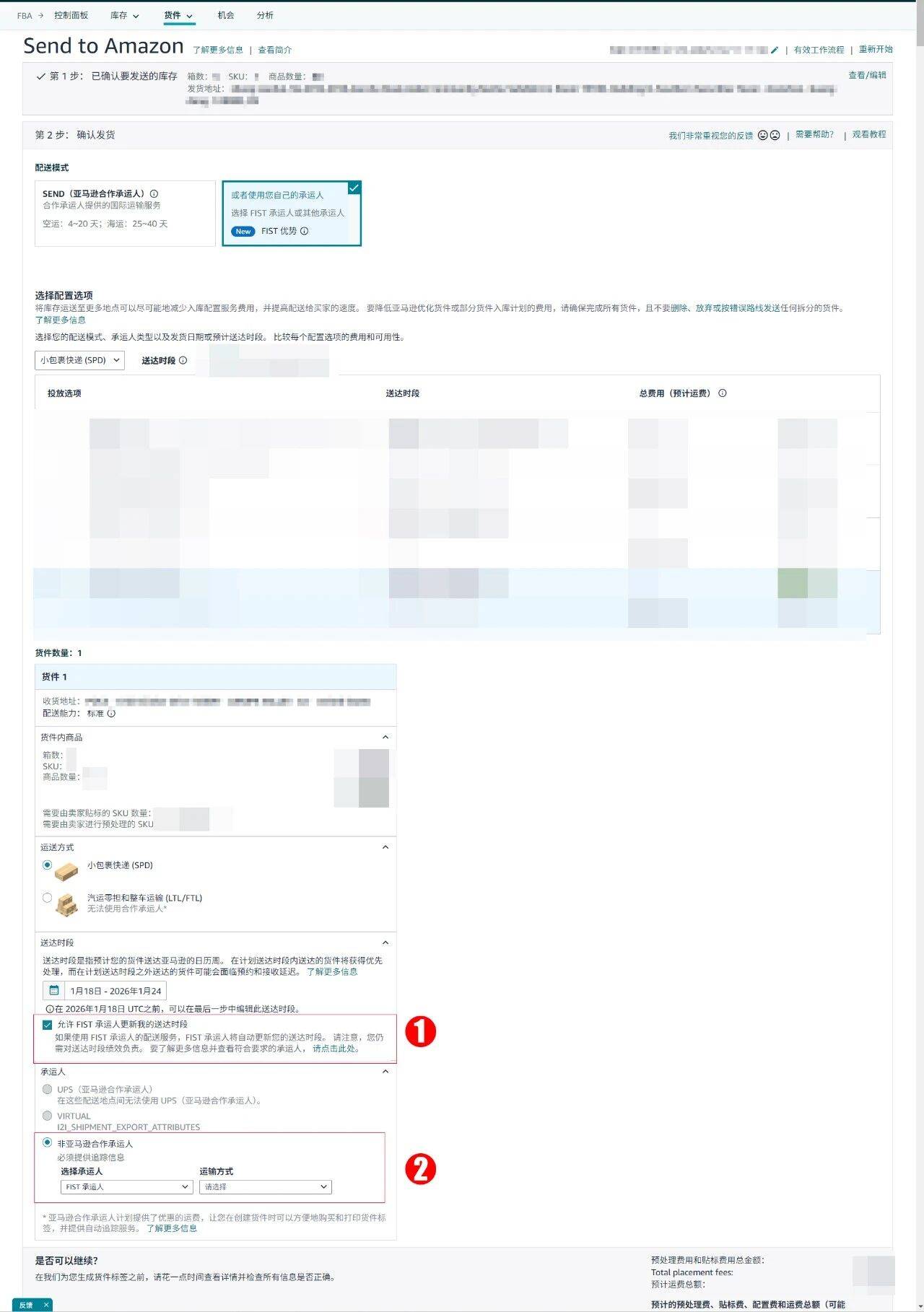 ☑【承运人】处保持默认【非亚马逊合作承运人】-【FIST承运人】勾选,请勿修改,两者缺一不可;