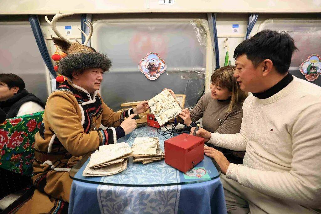 行程中,列车餐车变身为“移动文化展厅”,开展东北秧歌教学、剪窗花、包饺子及满族传统游戏“嘎拉哈”体验等活动。来自漠河的非遗传承人还现场展示了鄂伦春族小调、鄂伦春族传统桦树皮烙画、鄂伦春族口技、鄂伦春太阳花制作等技艺,吸引众多外国旅客踊跃参与。