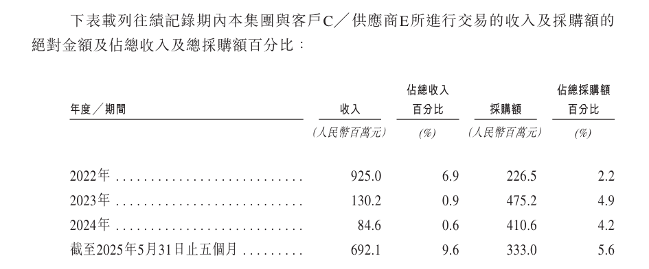 招股书显示,公司的主要客户C同时也是主要供应商E,双方长期保持“双向奔赴”的合作模式:创新实业向其销售铝锭,同时从其采购生产所需的核心原材料铝土矿。2022年至2025年1-5月期间,相关销售金额累计约18.3亿元,采购金额累计约14.5亿元,形成了深度绑定的业务关系。